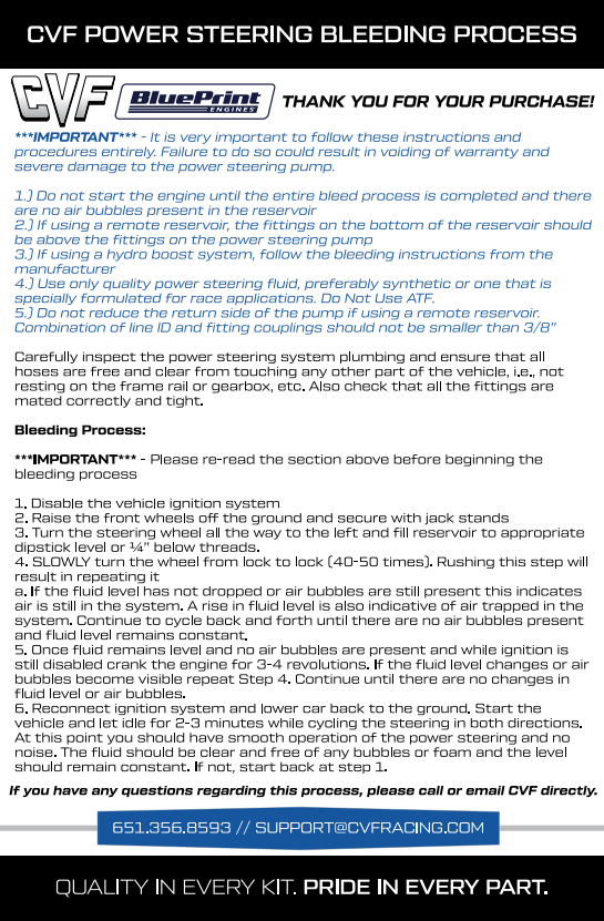 How do I bleed my power steering pump? Please follow CVF Racing's instructions below: CVF POWER STEERING BLEEDING PROCESS